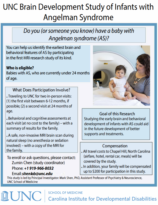 The Shen lab is recruiting for a study of brain development in babies with Angelman syndrome (AS). We are trying to identify the earliest brain and behavioral features of AS, and you can help us by participating in the first MRI research study of its kind. These babies will be compared to infants with fragile X syndrome (FXS), infants at higher likelihood for autism, infants with typical development, and infants with Down syndrome.